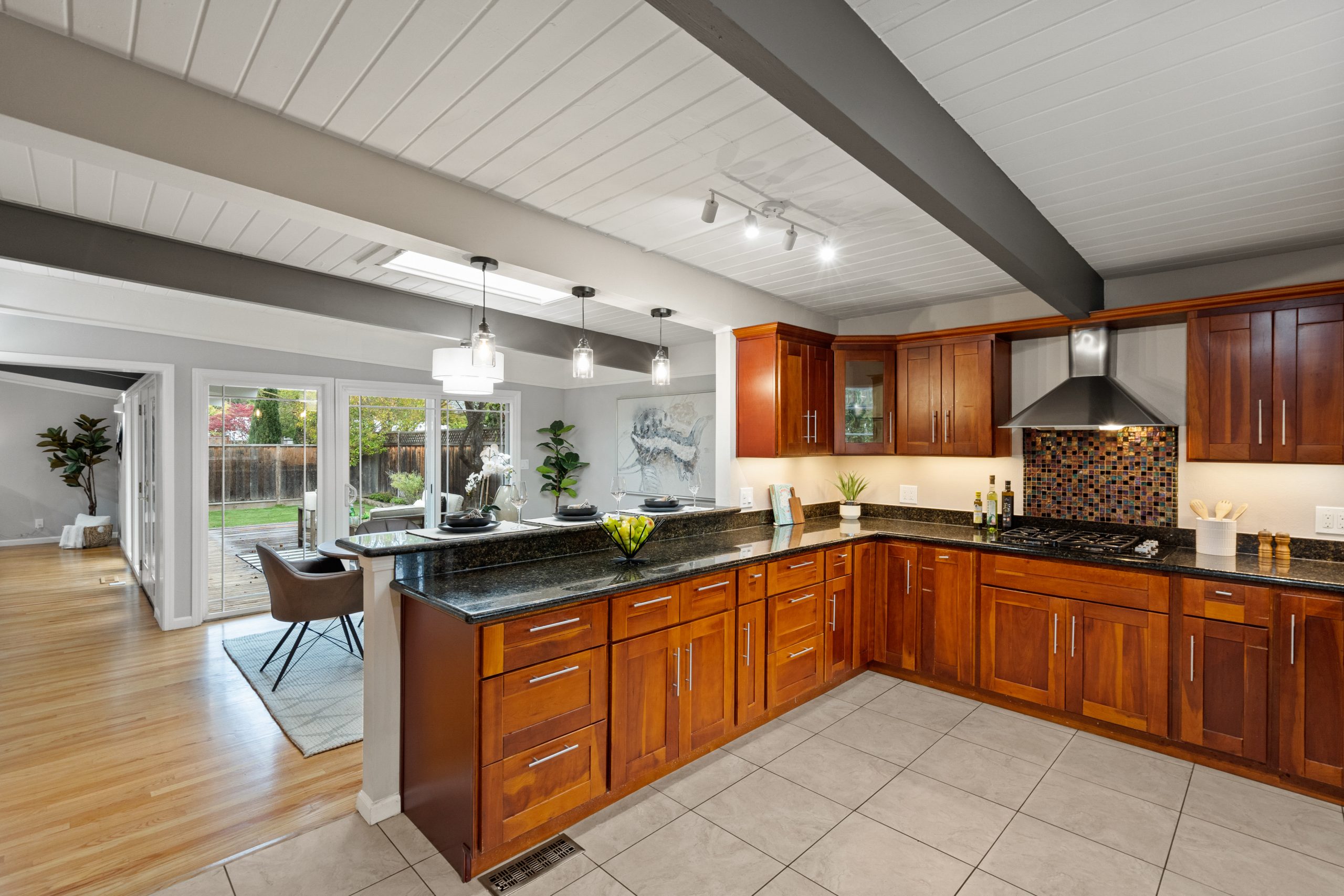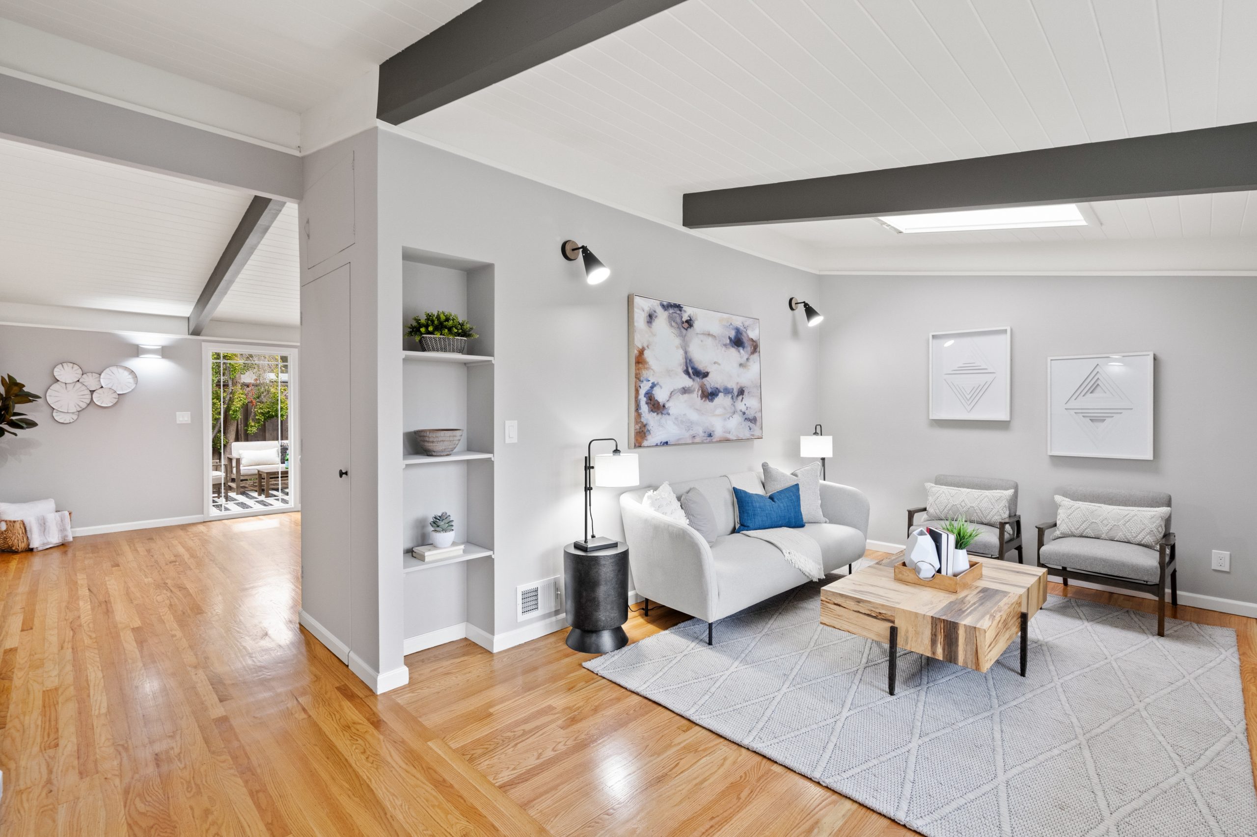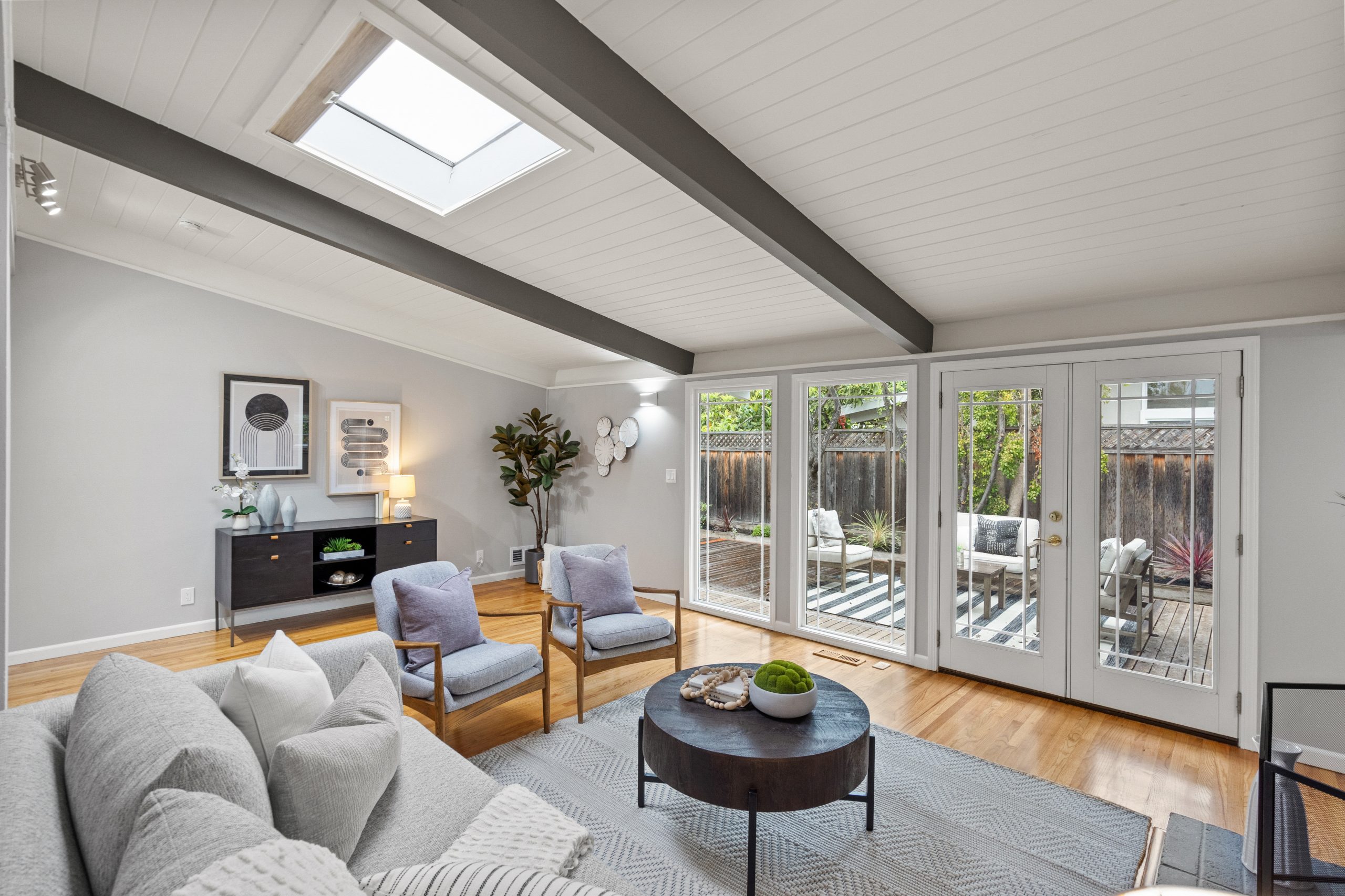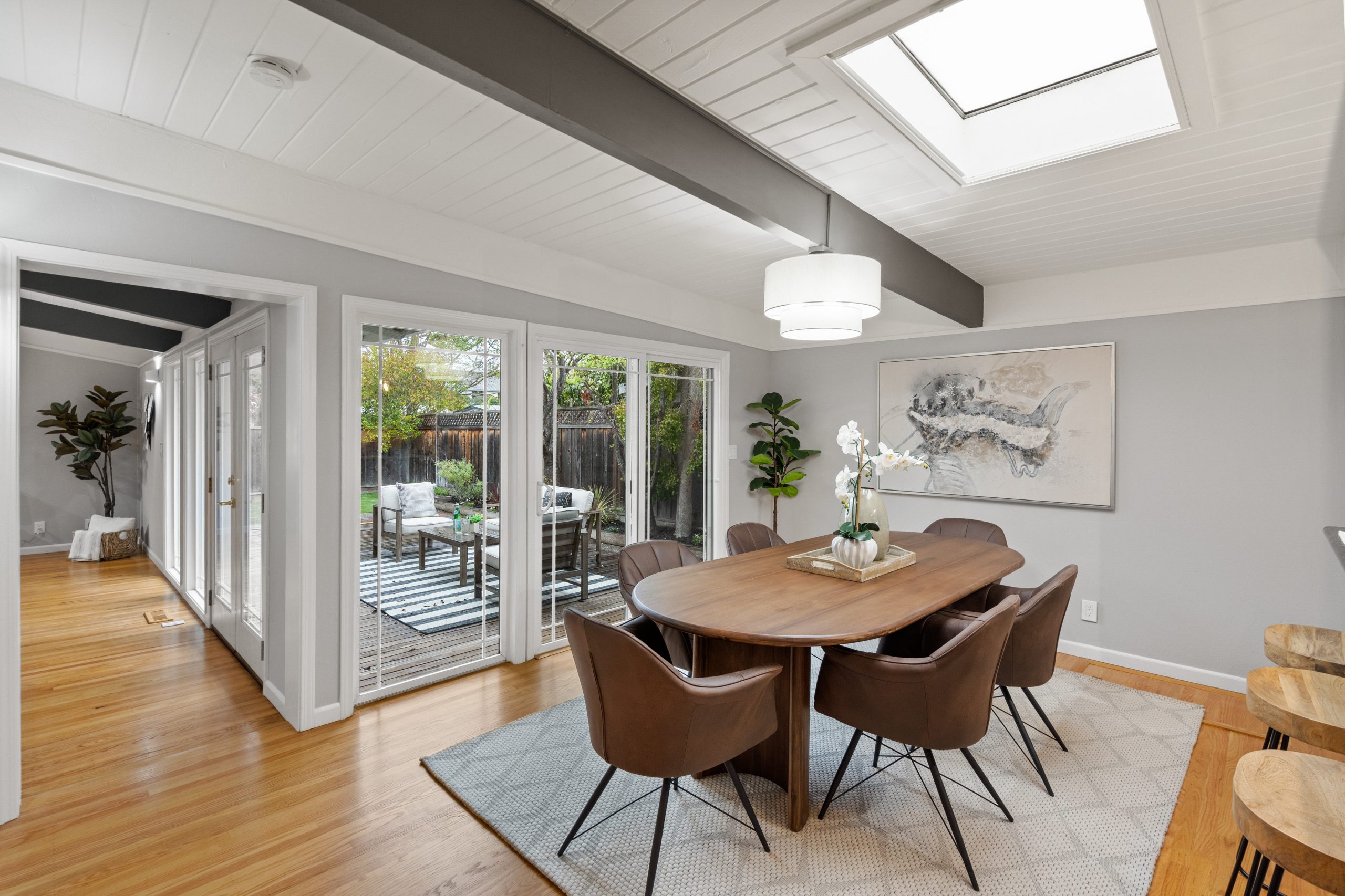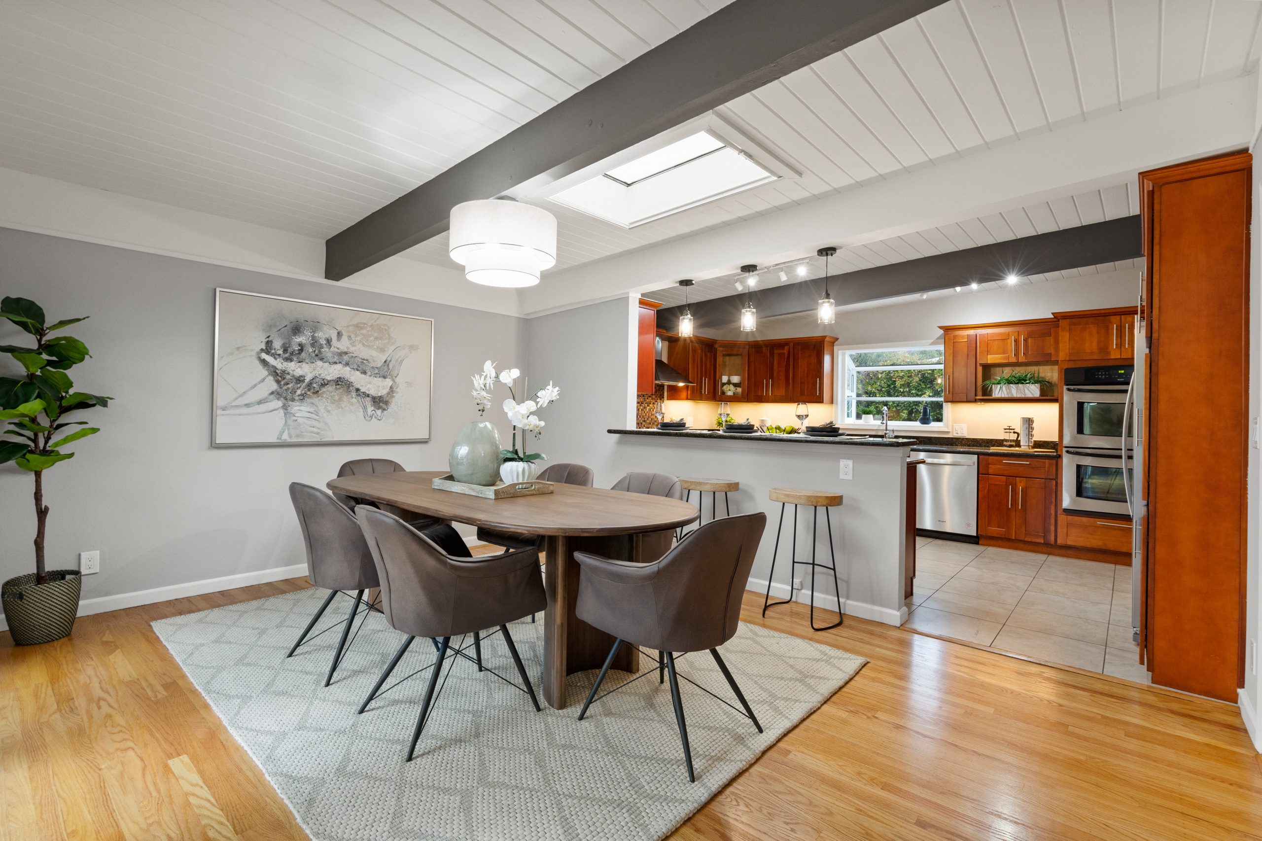 Welcome to this exceptional Brown & Kaufman home, exuding the timeless charm of mid-century modern architecture. Set in highly desirable Midtown Palo Alto, this thoughtfully designed home offers a serene setting with a layout that maximizes space and functionality. This 3-bedroom, 2.5 bathroom home boasts beautiful hardwood floors and exposed beam ceilings throughout the home creating an elegant, bright ambience.  A thoughtfully crafted floor plan effortlessly connects the living room, family room, dining area, and kitchen, creating an ideal space for both everyday living and entertaining. Located just moments from parks, entertainment, shopping, and commute routes, this home offers unparalleled convenience for the modern lifestyle.