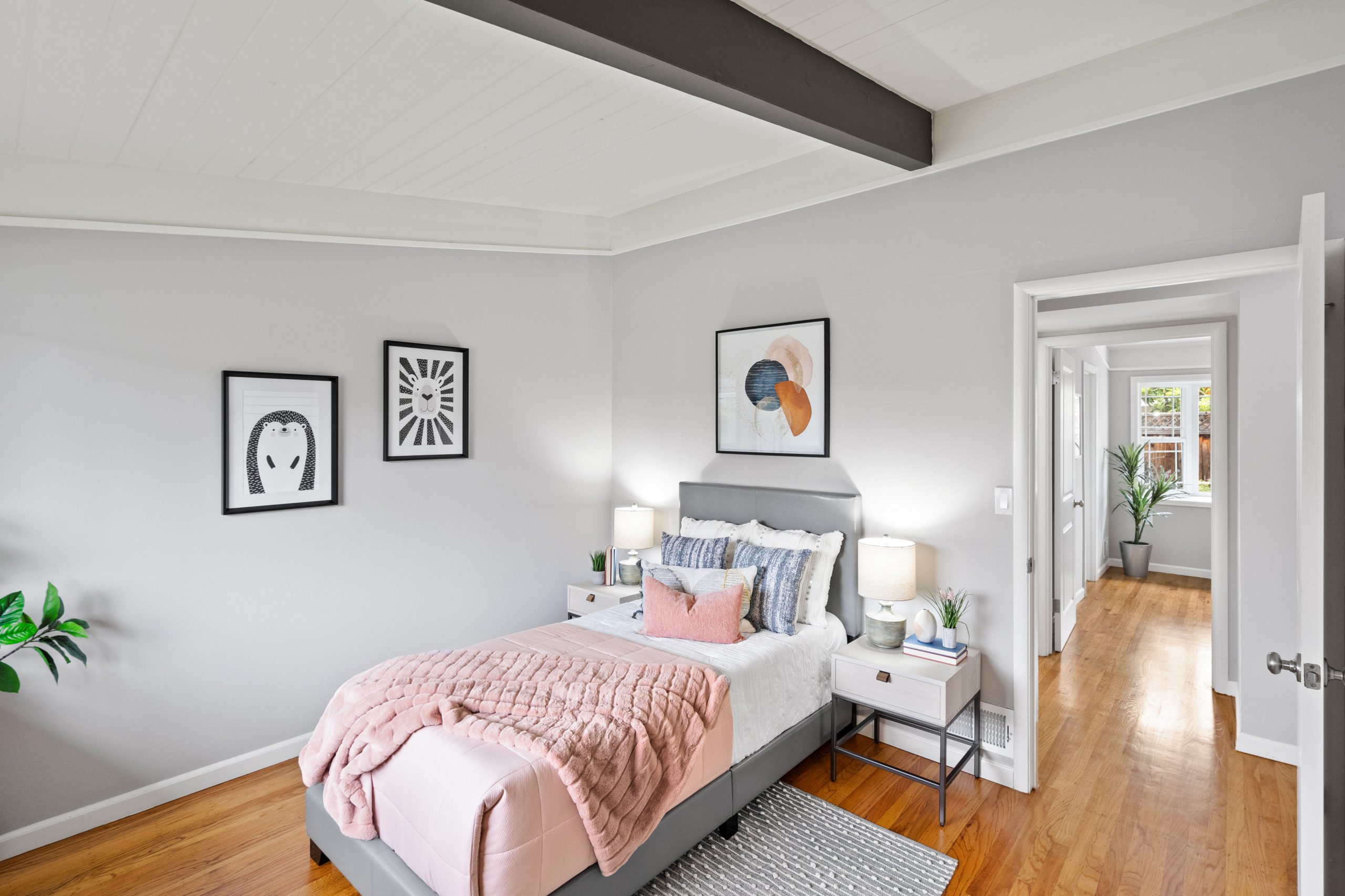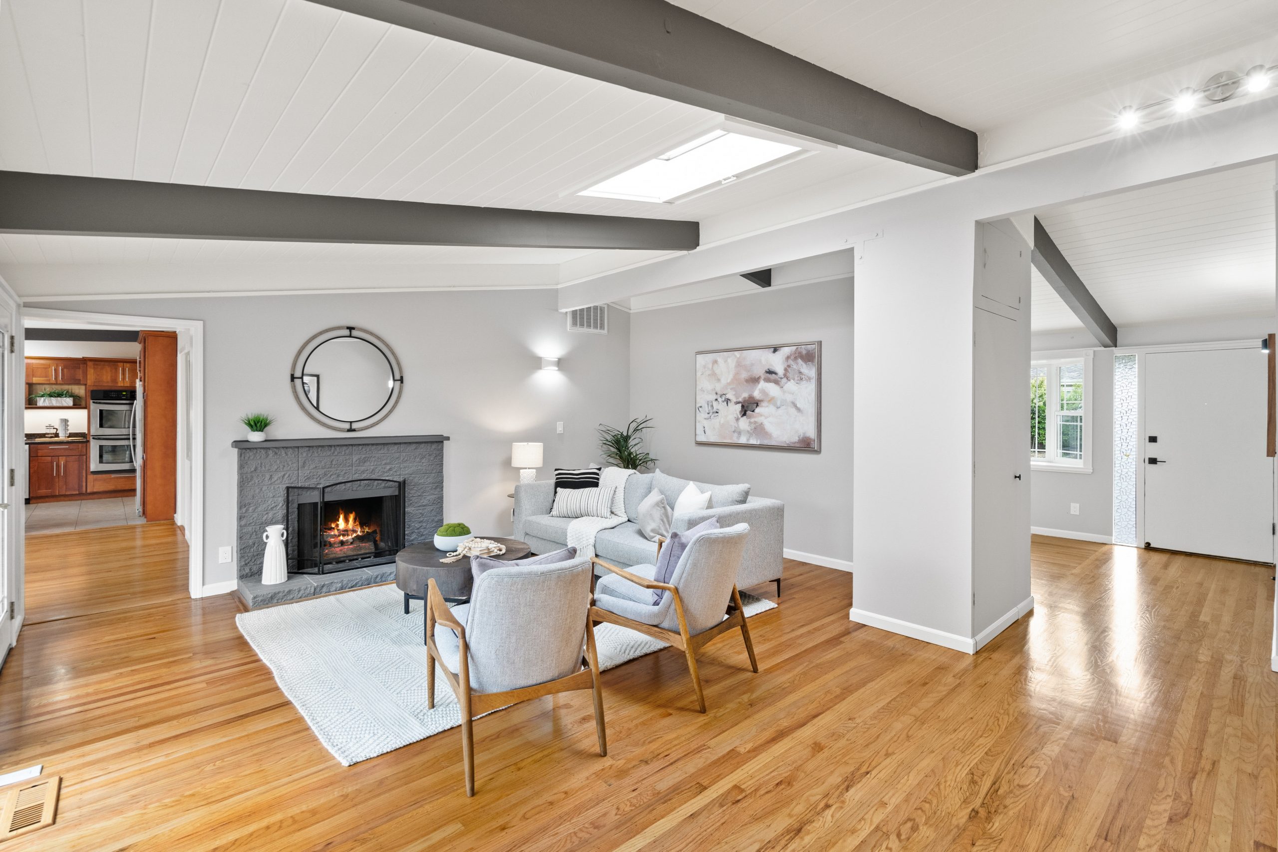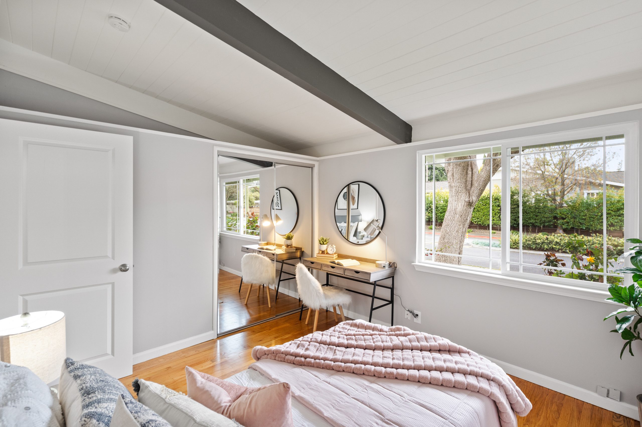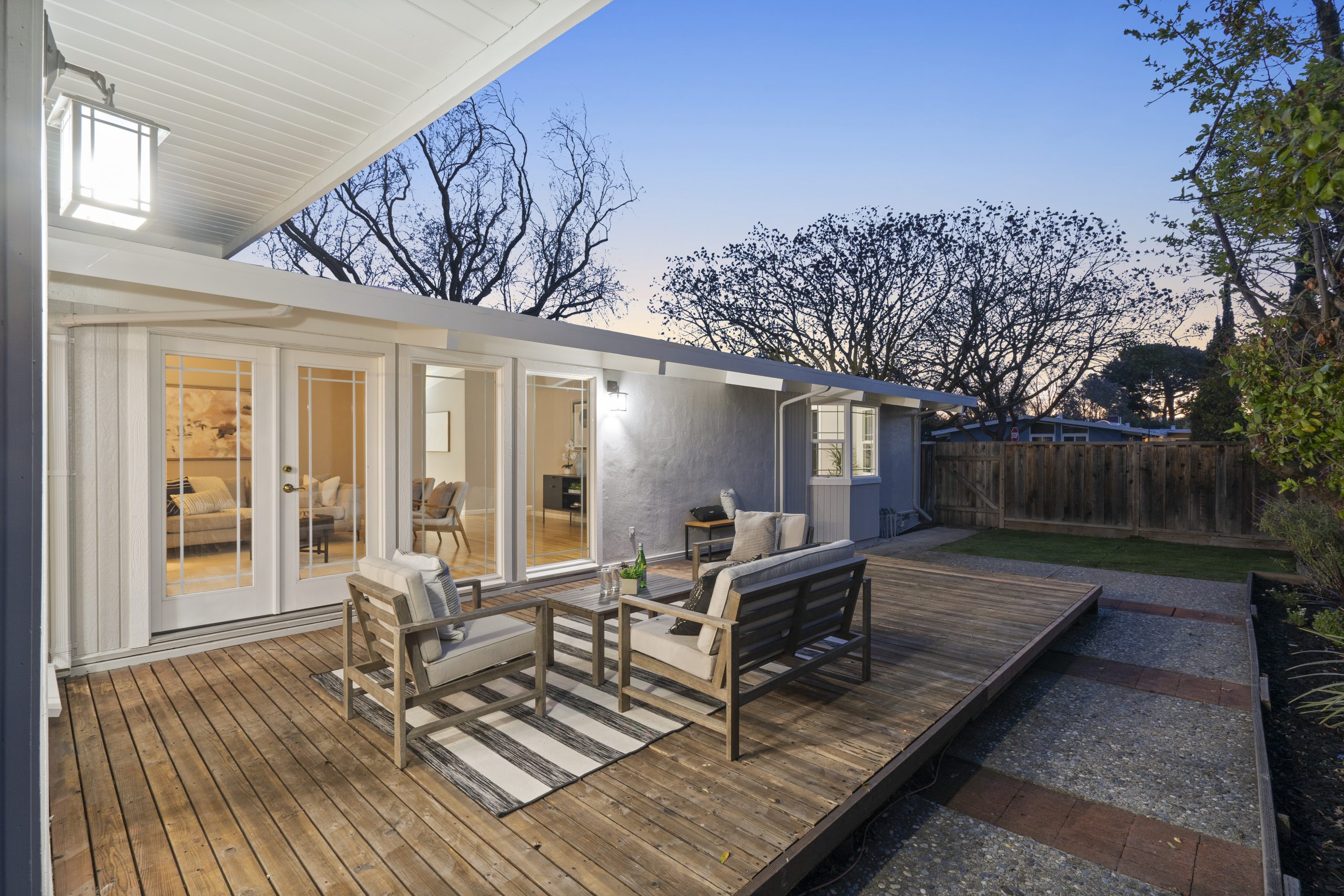 Welcome to this exceptional Brown & Kaufman home, exuding the timeless charm of mid-century modern architecture. Set in highly desirable Midtown Palo Alto, this thoughtfully designed home offers a serene setting with a layout that maximizes space and functionality. This 3-bedroom, 2.5 bathroom home boasts beautiful hardwood floors and exposed beam ceilings throughout the home creating an elegant, bright ambience.  A thoughtfully crafted floor plan effortlessly connects the living room, family room, dining area, and kitchen, creating an ideal space for both everyday living and entertaining. Located just moments from parks, entertainment, shopping, and commute routes, this home offers unparalleled convenience for the modern lifestyle.