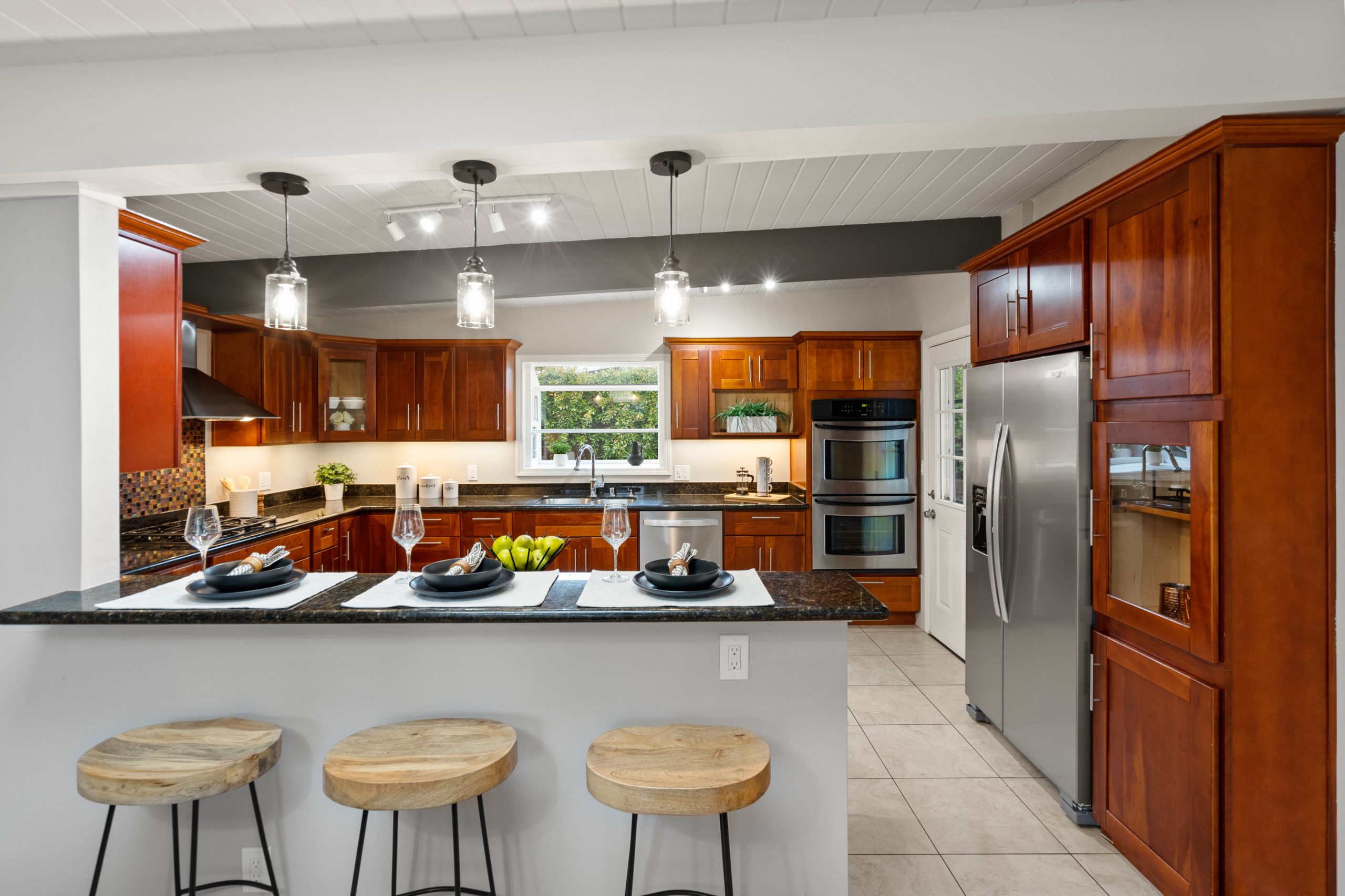 • The highly adaptable and functional horseshoe kitchen showcases granite countertops, stainless steel appliances, double oven, and ample storage space