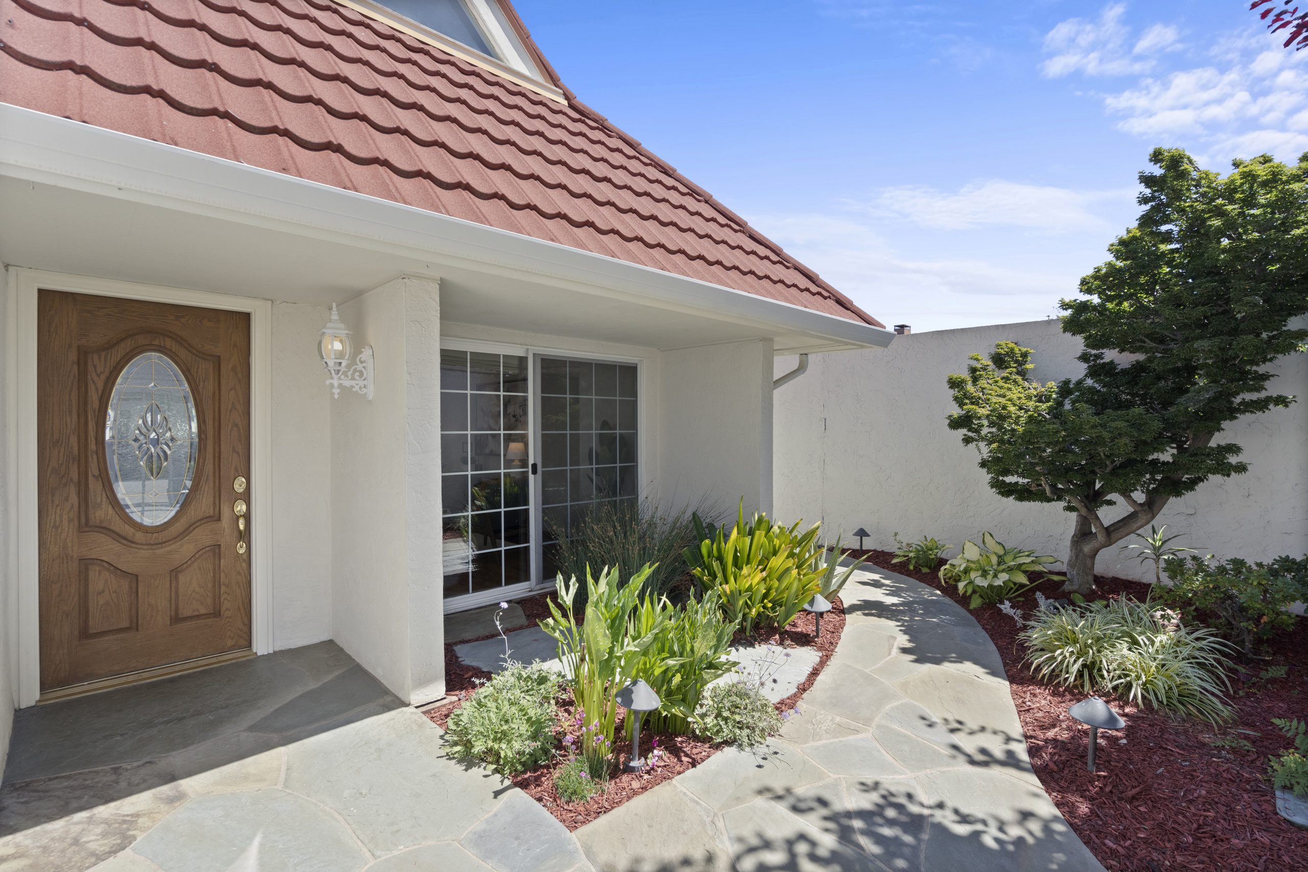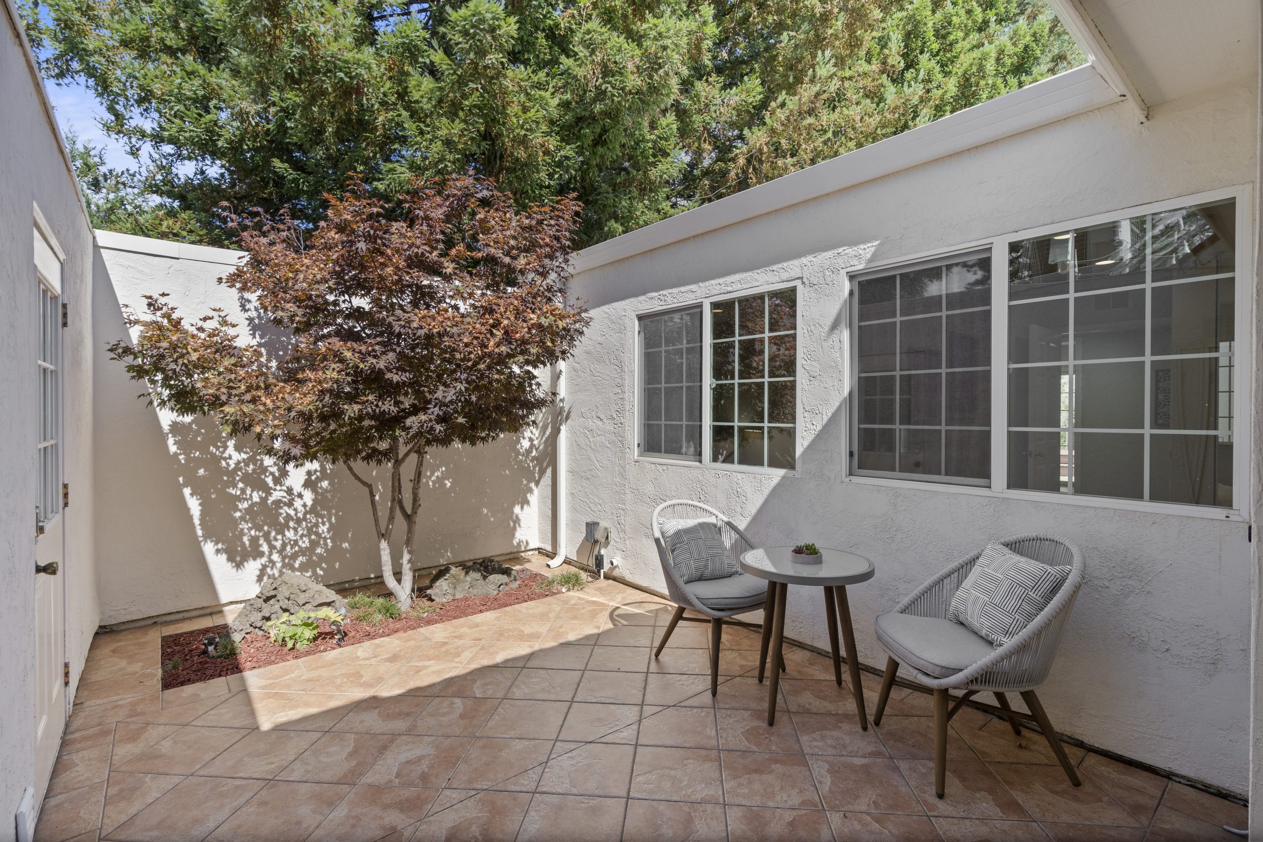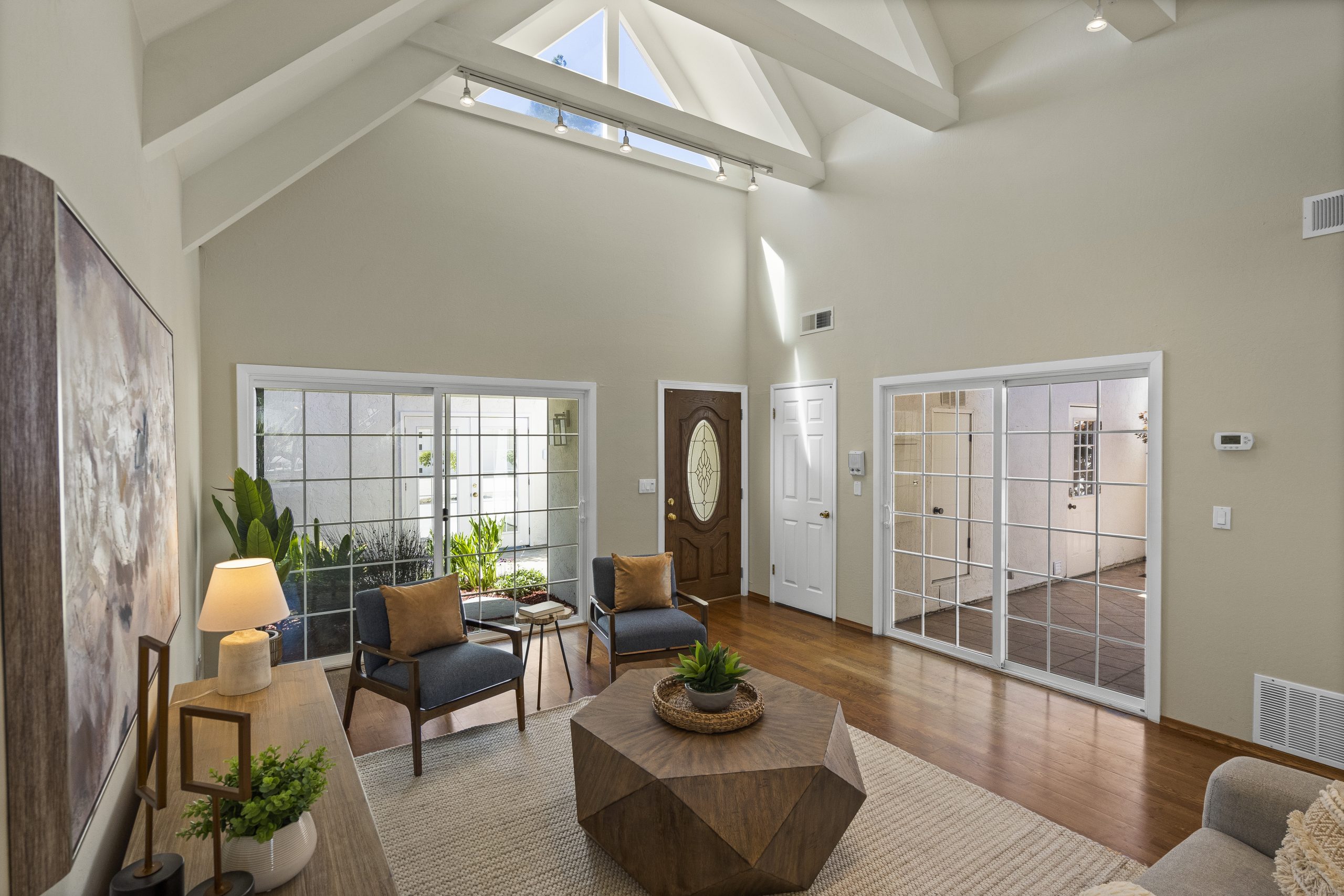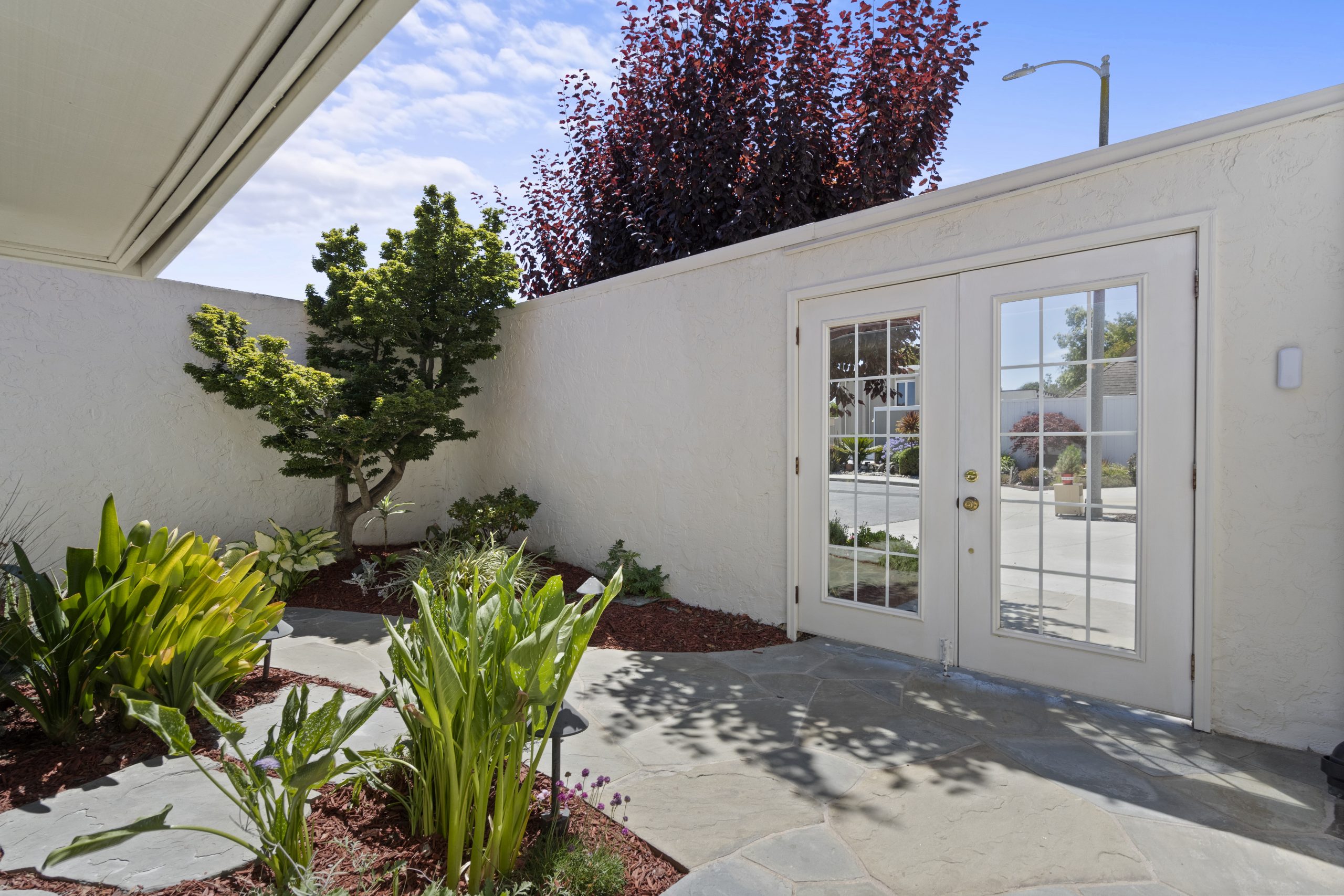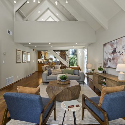Welcome to this Bahl Patio home, exuding the timeless charm of mid-century modern architecture, reminiscent of iconic Eichler homes. Set in a peaceful cul-de-sac, this thoughtfully designed home offers a serene setting with a layout that maximizes space and functionality. As you step into this home, you will be captivated by the vaulted ceilings in the living room that seamlessly connect to the dining and kitchen areas, creating a bright and open ambiance. With convenient access to both the front and backyard patios, you can effortlessly extend your living area outdoors for entertainment or relaxation.