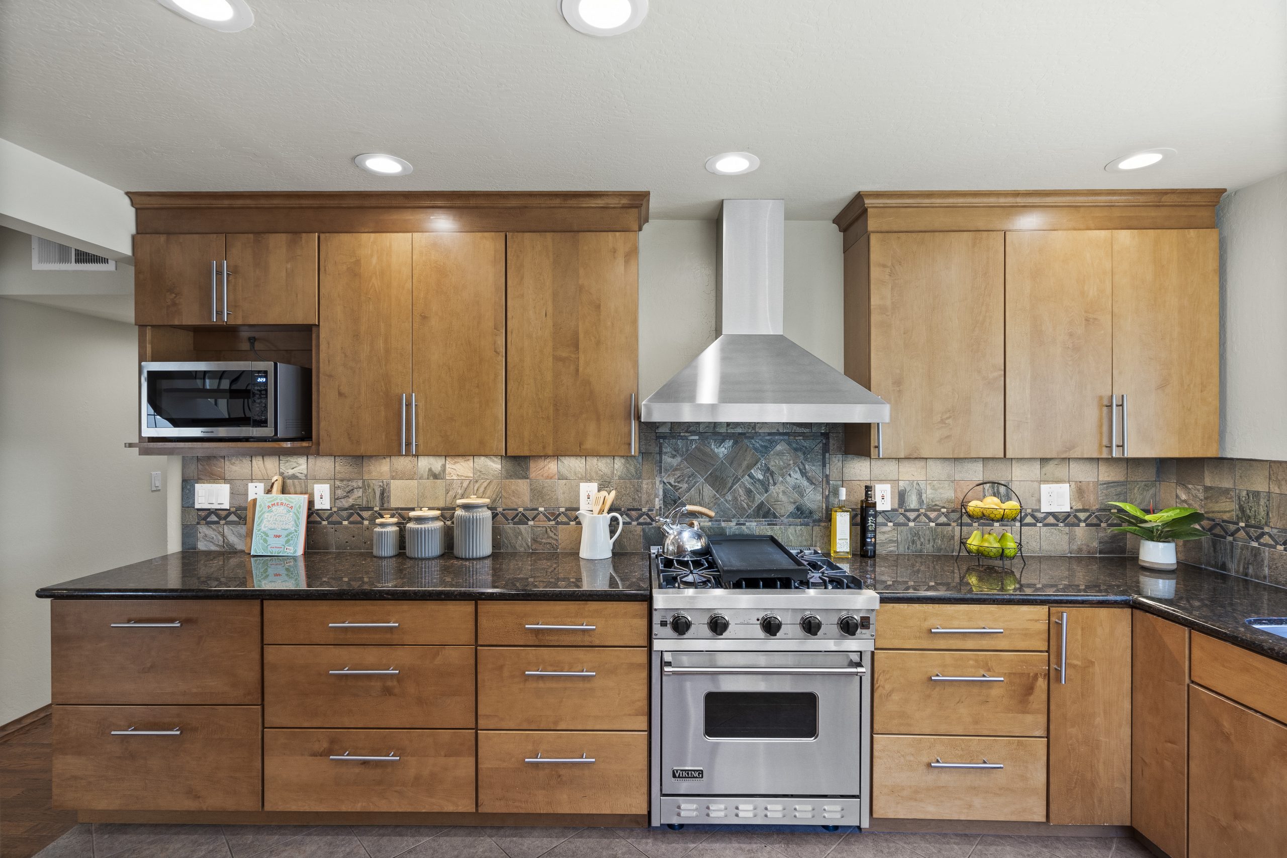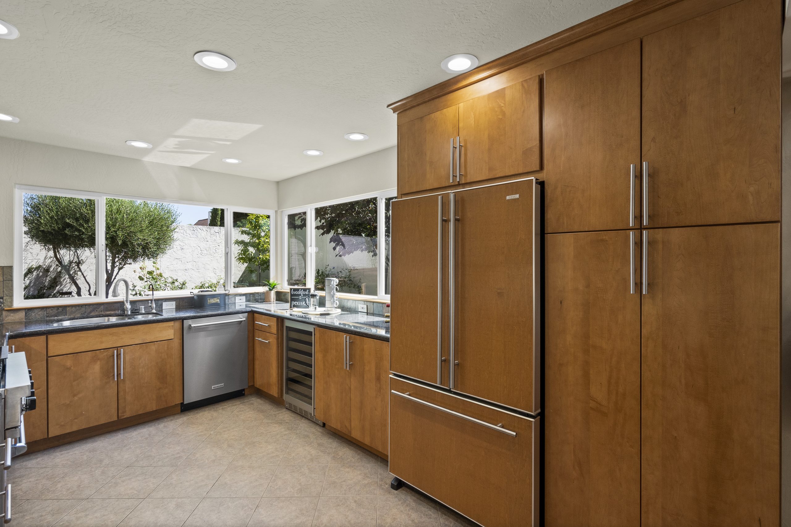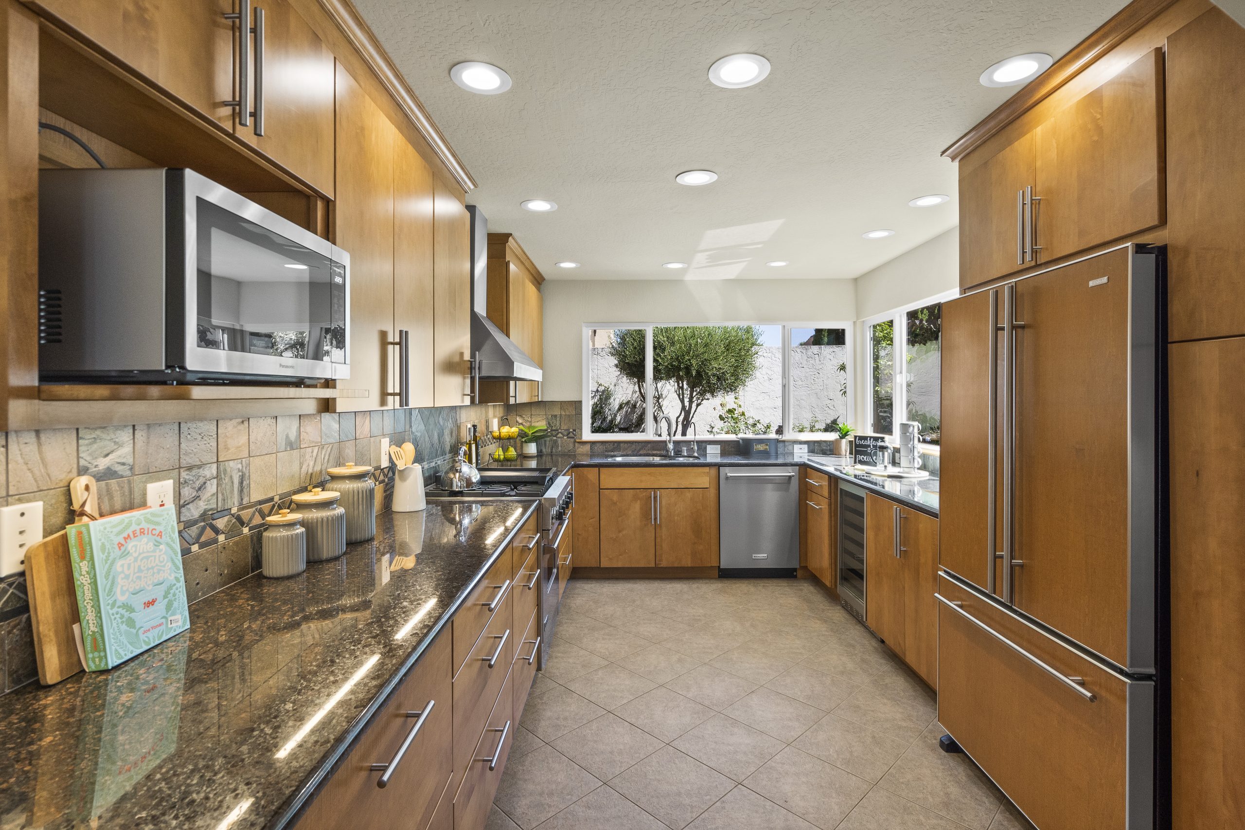 - The kitchen is a chef's delight, with sleek cabinetry that complements the high-end stainless steel appliances.