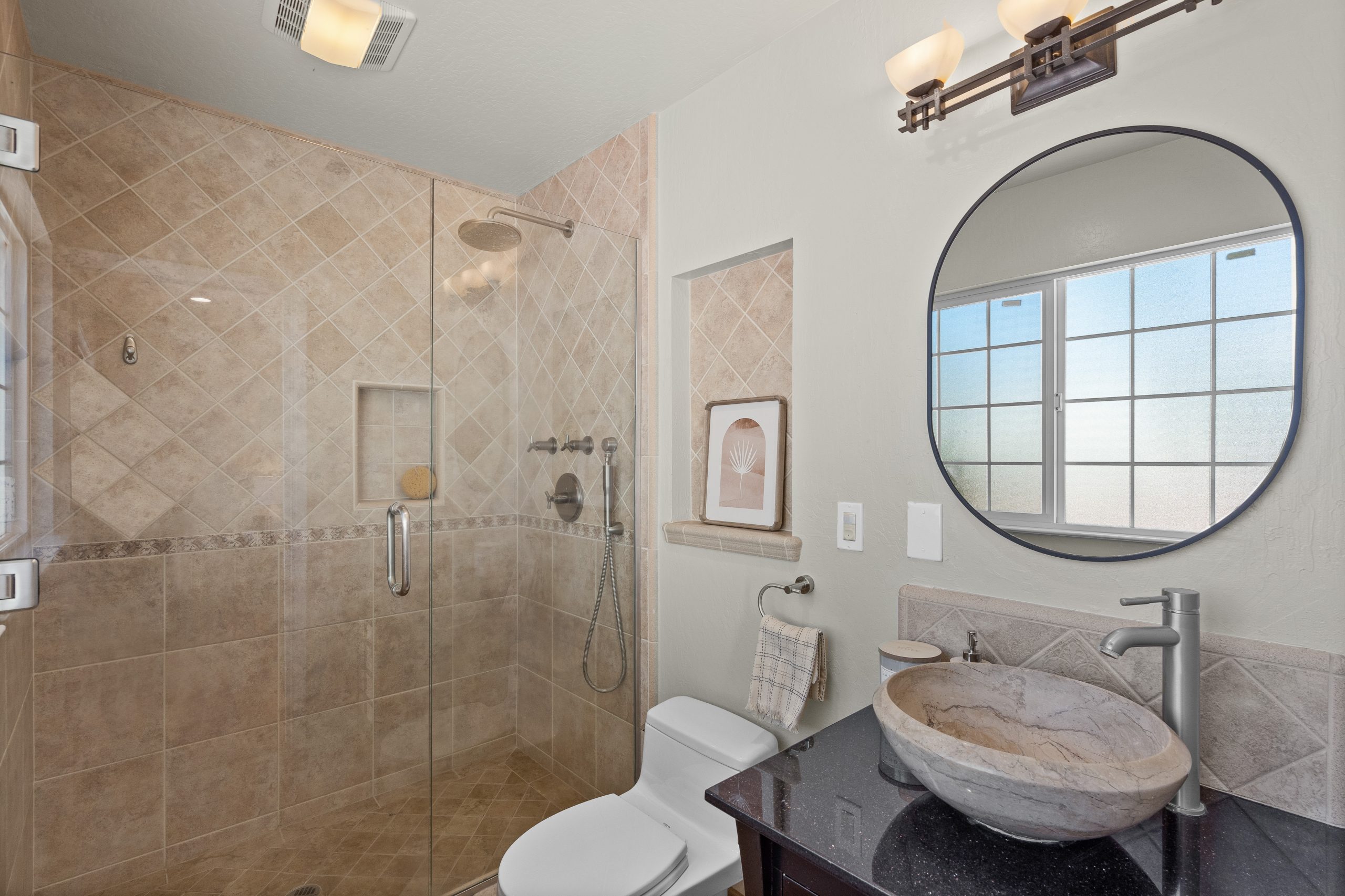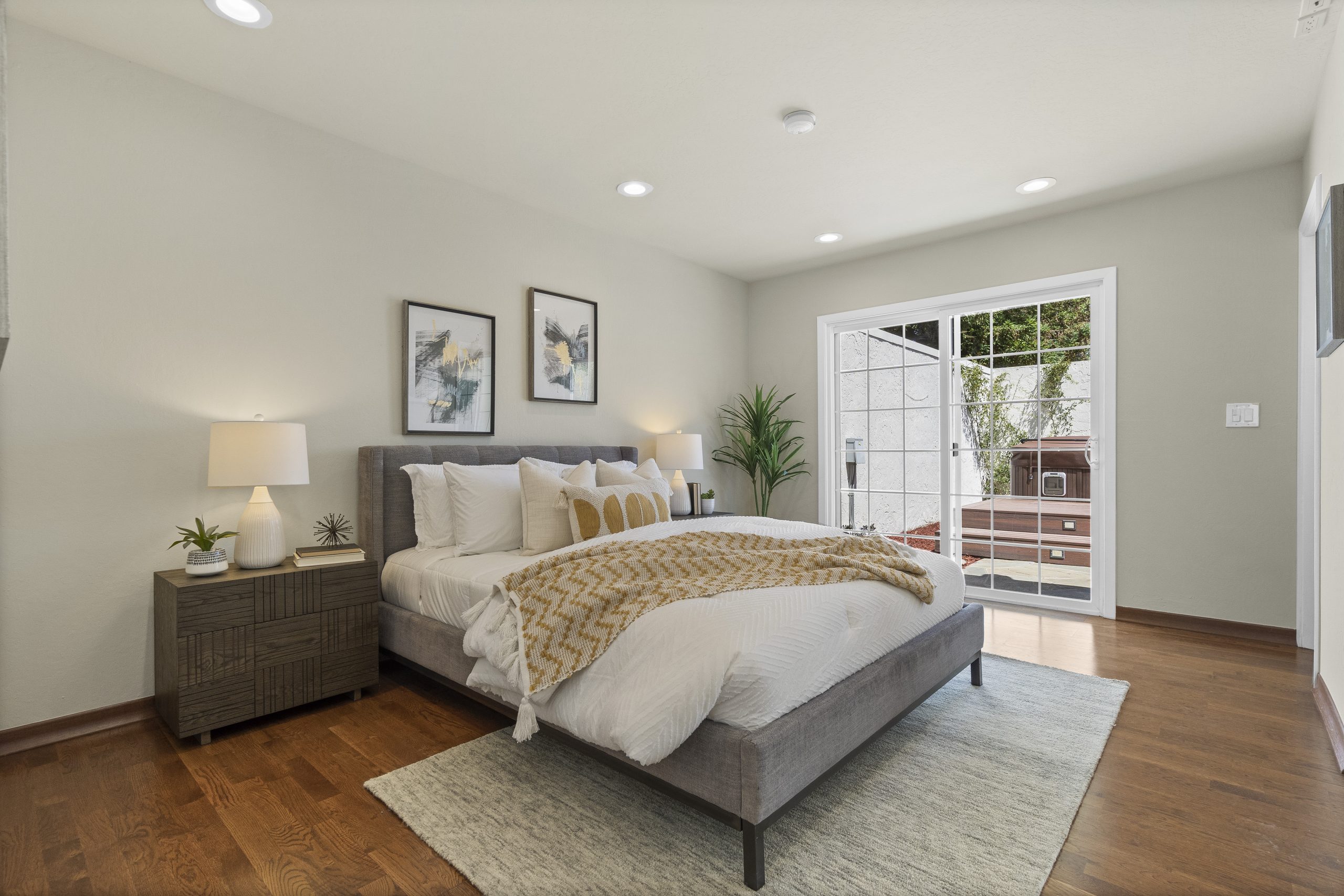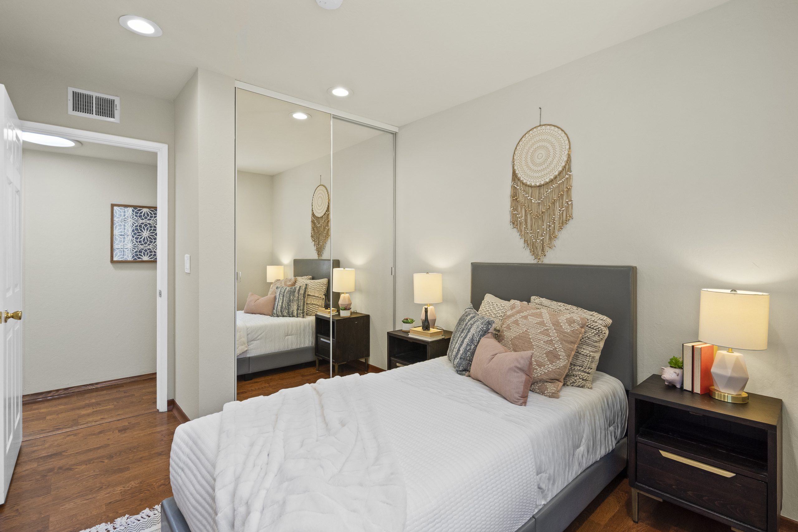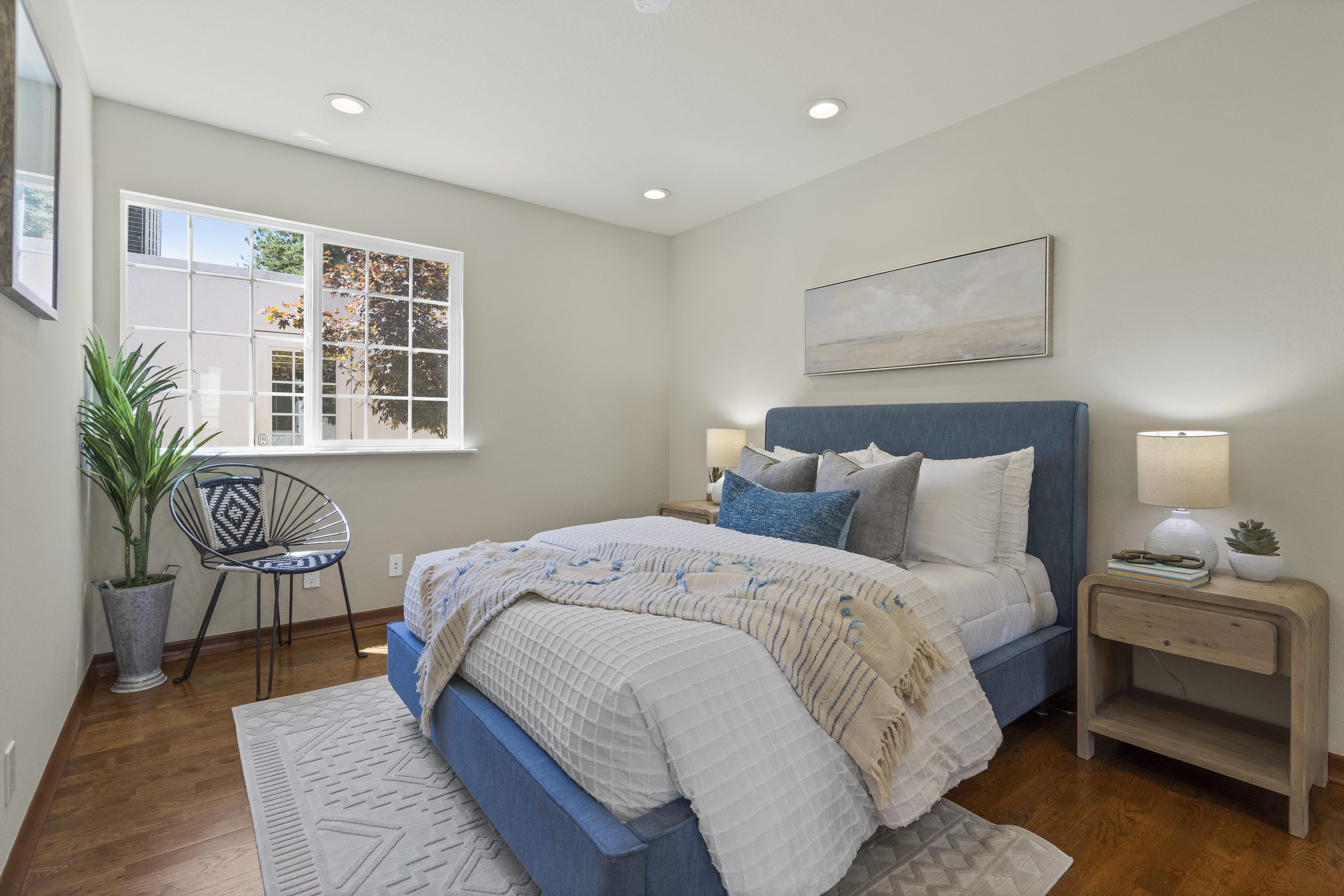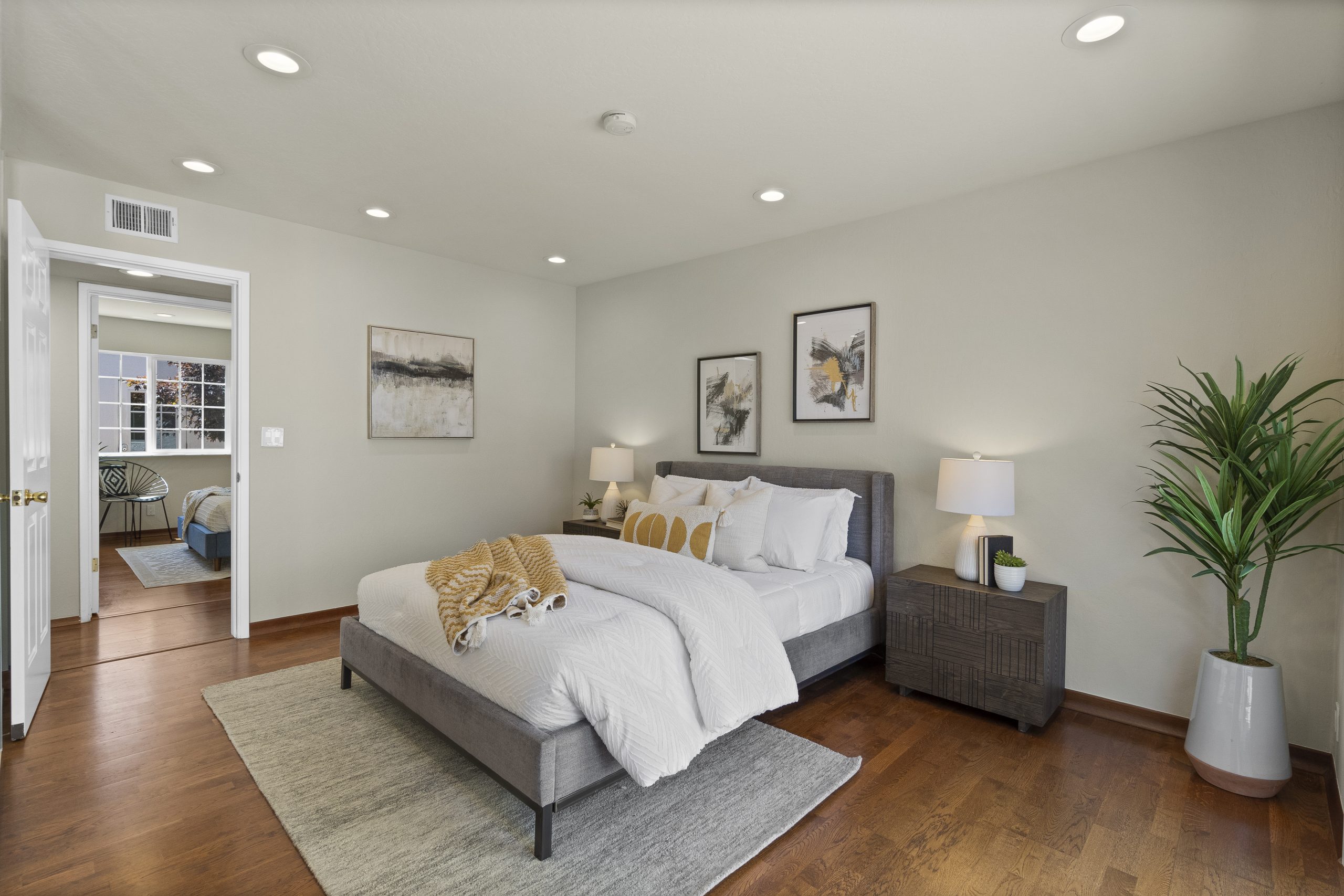 - Three bright bedrooms, each offering customized closet organization systems and large windows that capture natural light throughout the day.