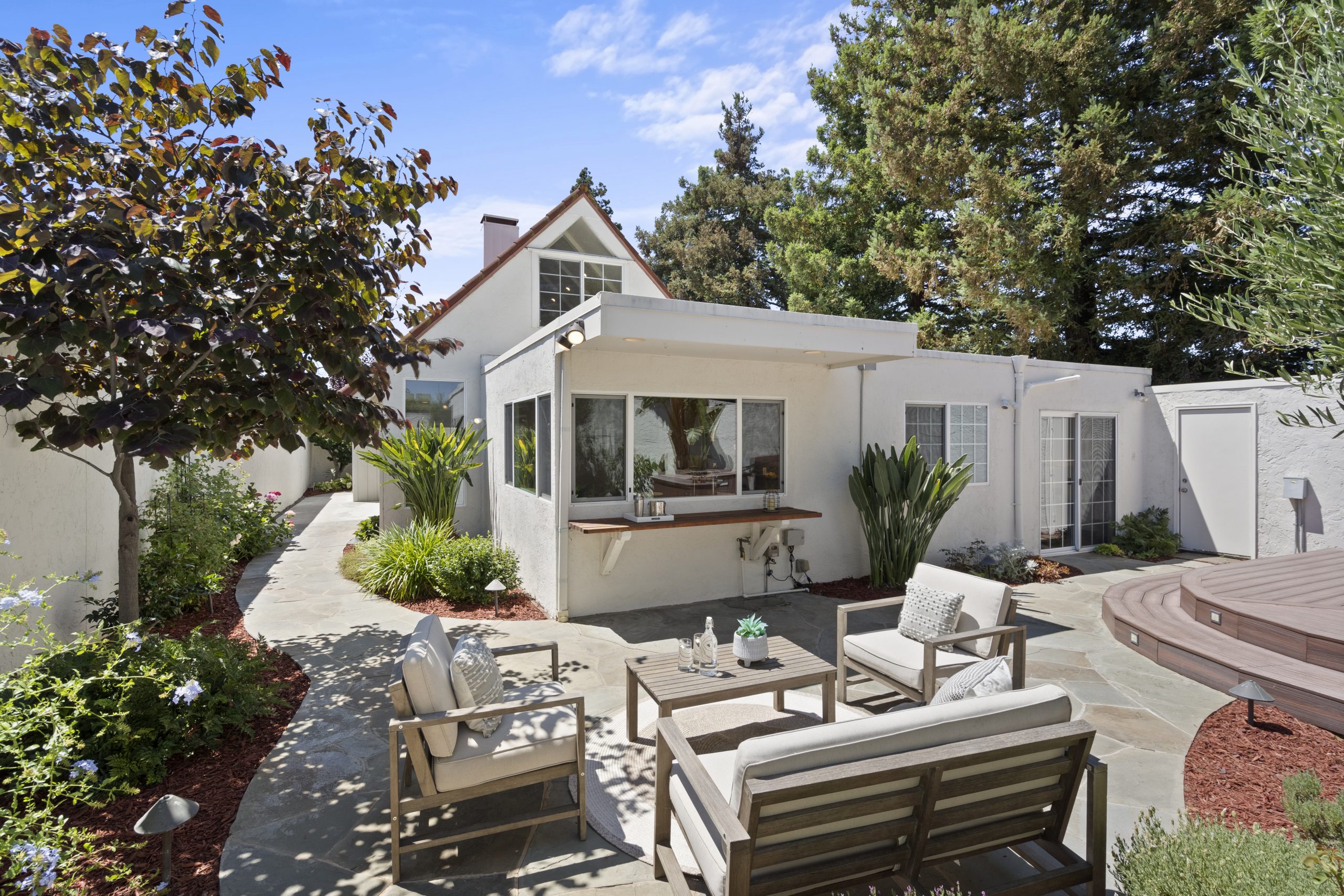 - A crafted wrap-around walkway guides you through the charming landscape from front to backyard, offering convenient access for entertainment and enjoyment.