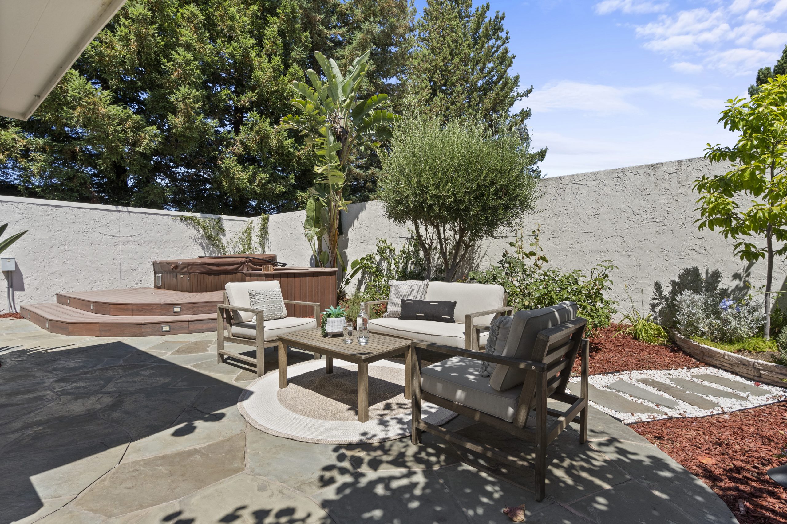 - Step out to the backyard oasis, where the focal point is a delightful patio featuring a quaint deck with an inset hot tub. This private retreat is perfect for hosting barbecues, family gatherings, or simply savoring peaceful moments amid lush greenery and mature trees.